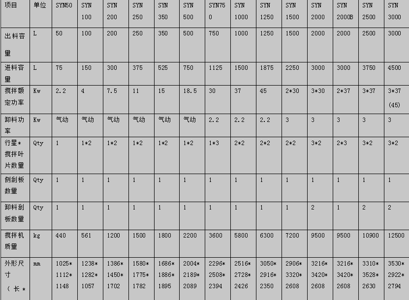 SYN系列立轴行星搅拌机技术参数